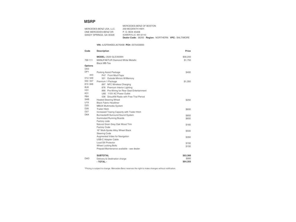 Service Work completed on this Mercedes-Benz GLE 350 included: Total Value: $637.95. Battery Voltage Test, Tires Inspected, Brake Inspection, Emissions System Check, Professional Detailed Inside and Out, Function Test all Lights, Cooling System Inspection, Transmission Fluid Inspection, Differential Fluid Inspection, Function Test all Options & Accessories.