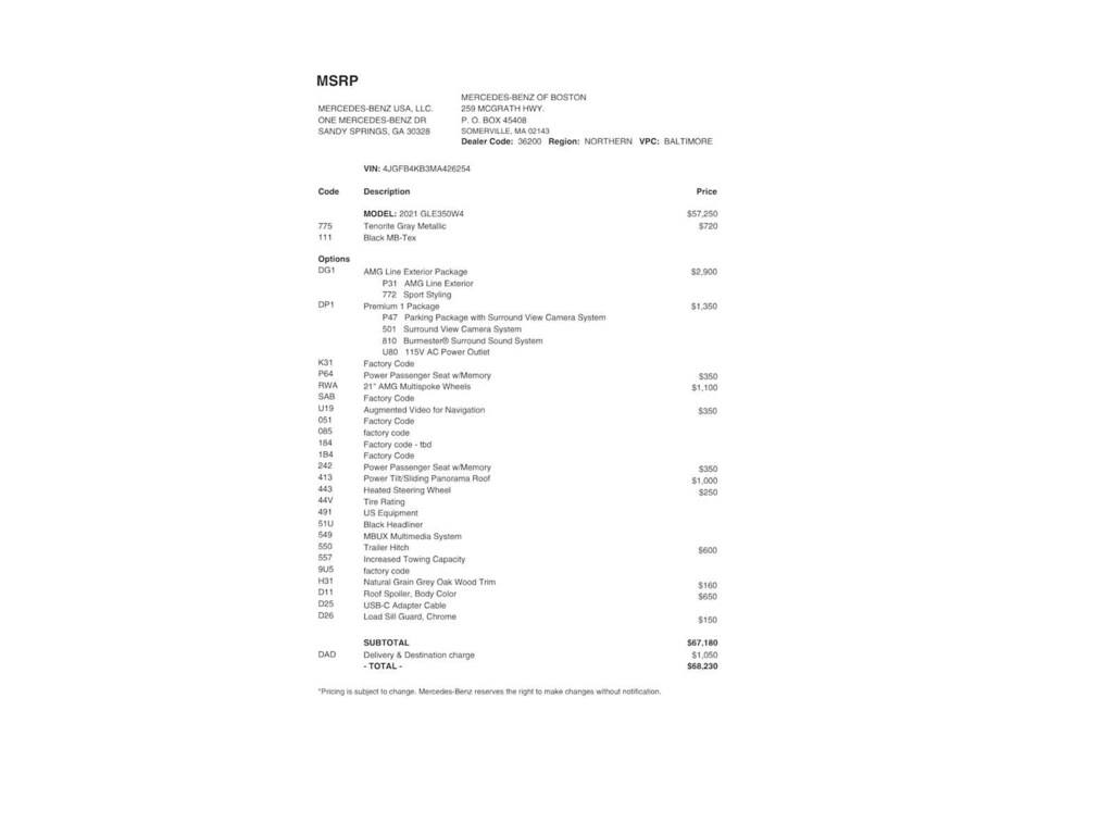 AMG® LINE EXTERIOR diamond radiator grille w/pins in chrome, integral Mercedes star and single louvre painted in matte iridium silver w/chrome insert, AMG® front apron in an A-wing design w/AMG®-specific air inlets in the wheel arch linings, flared wheel arches at front and rear, painted in the vehicle color, side sill panels painted in the vehicle color, AMG® rear apron w/diffuser-look insert in black and trim strip in chrome, AMG® Bodystyling, AMG® Line Exterior (P31), PREMIUM PACKAGE Parking Assist Code, Surround View System, 115V Power Outlet, Burmester® Surround Sound System, PANORAMA SLIDING SUNROOF, WHEELS: 21 AMG® MULTISPOKE Tires: 275/45R21 Fr & 315/40R21 Rr, BODY COLOR ROOF SPOILER, TRAILER HITCH Increased Towing Capacity, PASSENGER SEAT MEMORY, MBUX AUGMENTED VIDEO FOR NAVIGATION, HEATED STEERING WHEEL.
