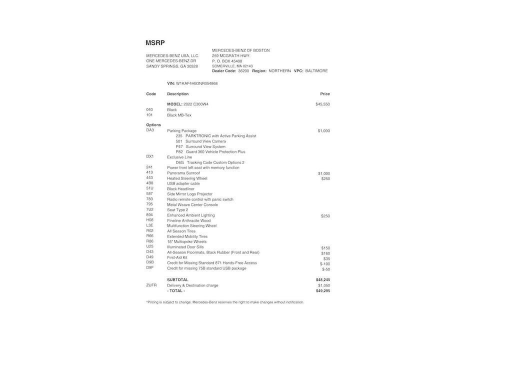 Service Work completed on this Mercedes-Benz C 300 included: Total Value: $2,605.70. Oil & Filter Change Using Original OEM Parts, Battery Voltage Test, Windshield Wiper Blades Replaced, Tires Inspected, 4 Tires Replaced, Wheel/Tire Balance, Brake Inspection, Emissions System Check, Professional Detailed Inside and Out, Function Test all Lights, Cooling System Inspection, Transmission Fluid Inspection, Differential Fluid Inspection, Function Test all Options & Accessories.