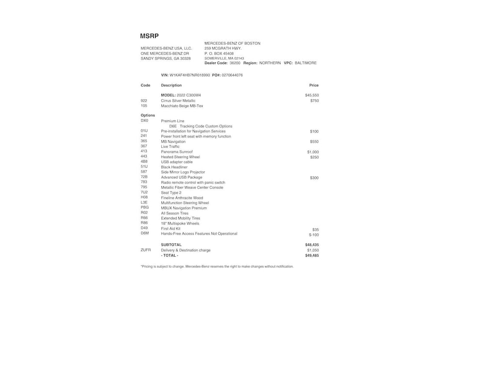 Service Work completed on this Mercedes-Benz C 300 included: Total Value: $2,467.61. Oil & Filter Change Using Original OEM Parts, Battery Voltage Test, Windshield Wiper Blades Replaced, Tires Inspected, 3 Tires Replaced, Brake Inspection, 4 Wheel Alignment, Emissions System Check, Professional Detailed Inside and Out, Function Test all Lights, Cooling System Inspection, Transmission Fluid Inspection, Differential Fluid Inspection, Function Test all Options & Accessories.