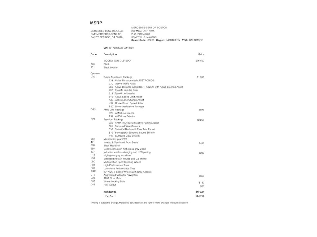 Service Work completed on this Mercedes-Benz CLS 450 included: Total Value: $3,019.30. Oil & Filter Change Using Original OEM Parts, Battery Voltage Test, Windshield Wiper Blades Replaced, Tires Inspected, 4 Tires Replaced, Brake Inspection, 4 Wheel Alignment, Emissions System Check, Professional Detailed Inside and Out, Function Test all Lights, Cooling System Inspection, Transmission Fluid Inspection, Differential Fluid Inspection, Function Test all Options & Accessories.