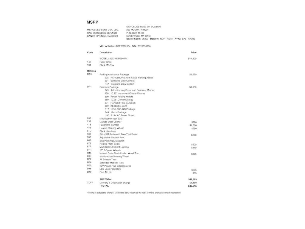 Service Work completed on this Mercedes-Benz GLB 250 included: Total Value: $2,622.87. Oil & Filter Change Using Original OEM Parts, Battery Voltage Test, Windshield Wiper Blades Replaced, Rear Glass Wiper Blade Replaced, Tires Inspected, 4 Tires Replaced, Brake Inspection, 4 Wheel Alignment, Emissions System Check, Professional Detailed Inside and Out, Function Test all Lights, Cooling System Inspection, Transmission Fluid Inspection, Differential Fluid Inspection, Function Test all Options & Accessories.