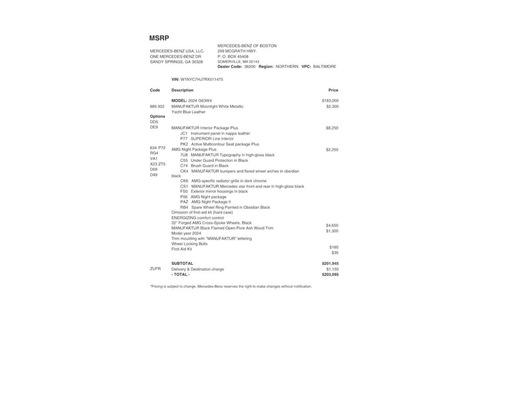 MANUFAKTUR INTERIOR PACKAGE PLUS: MANUFAKTUR Interior Package Plus, upper door panels, kneepads plus inside of tailgate in exclusive Nappa leather w/diamond design, Upper & Lower Dashboard in Nappa Leather, G manufaktur Front Passenger Grab Handle Badge, Armrests in Exclusive Nappa Leather, Seat Comfort Package, Drive-Dynamic Multicontour Front Seats w/Massage, ENERGIZING Comfort Control, Rapid Heating Front Seats, Front Ventilated Seats, WHEELS: 22 AMG® MATTE BLACK CROSS-SPOKE FORGED Tires: 295/40R22, AMG® NIGHT PACKAGE PLUS: AMG® Night Package (P56), Brush Guard in Black, Black Under Guard Protection, Exterior Mirrors Painted in Obsidian Black, Spare Wheel Cover in Obsidian Black, trim bumper elements, Gunmetal Grey Front Grille, Mercedes-Benz Star in Black, Exterior Lettering in Black, Wheel Arches & Bumpers in Black, MANUFAKTUR BLACK-FLAMED ASH WOOD TRIM.