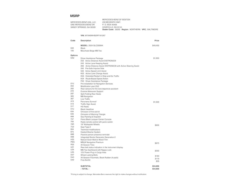 Service Work completed on this Mercedes-Benz GLC 300 included: Total Value: $1,182.70. Oil & Filter Change Using Original OEM Parts, Battery Voltage Test, Windshield Wiper Blades Replaced, Tires Inspected, Brake Inspection, Emissions System Check, Professional Detailed Inside and Out, Function Test all Lights, Cooling System Inspection, Transmission Fluid Inspection, Differential Fluid Inspection, Function Test all Options & Accessories.