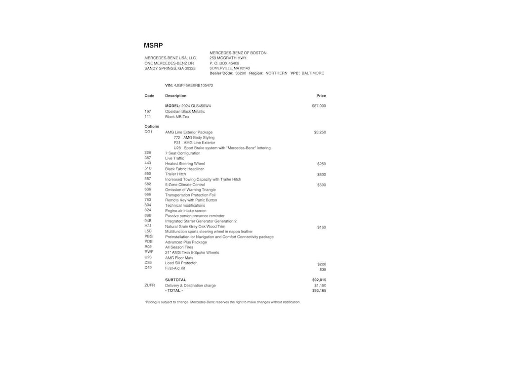 Service Work completed on this Mercedes-Benz GLS 450 included: Total Value: $2,516.85. Oil & Filter Change Using Original OEM Parts, Battery Voltage Test, Windshield Wiper Blades Replaced, Rear Glass Wiper Blade Replaced, Tires Inspected, 2 Tires Replaced, Brake Inspection, Cabin Air Filter Replaced, Emissions System Check, Professional Detailed Inside and Out, Function Test all Lights, Cooling System Inspection, Transmission Fluid Inspection, Differential Fluid Inspection, Function Test all Options & Accessories.