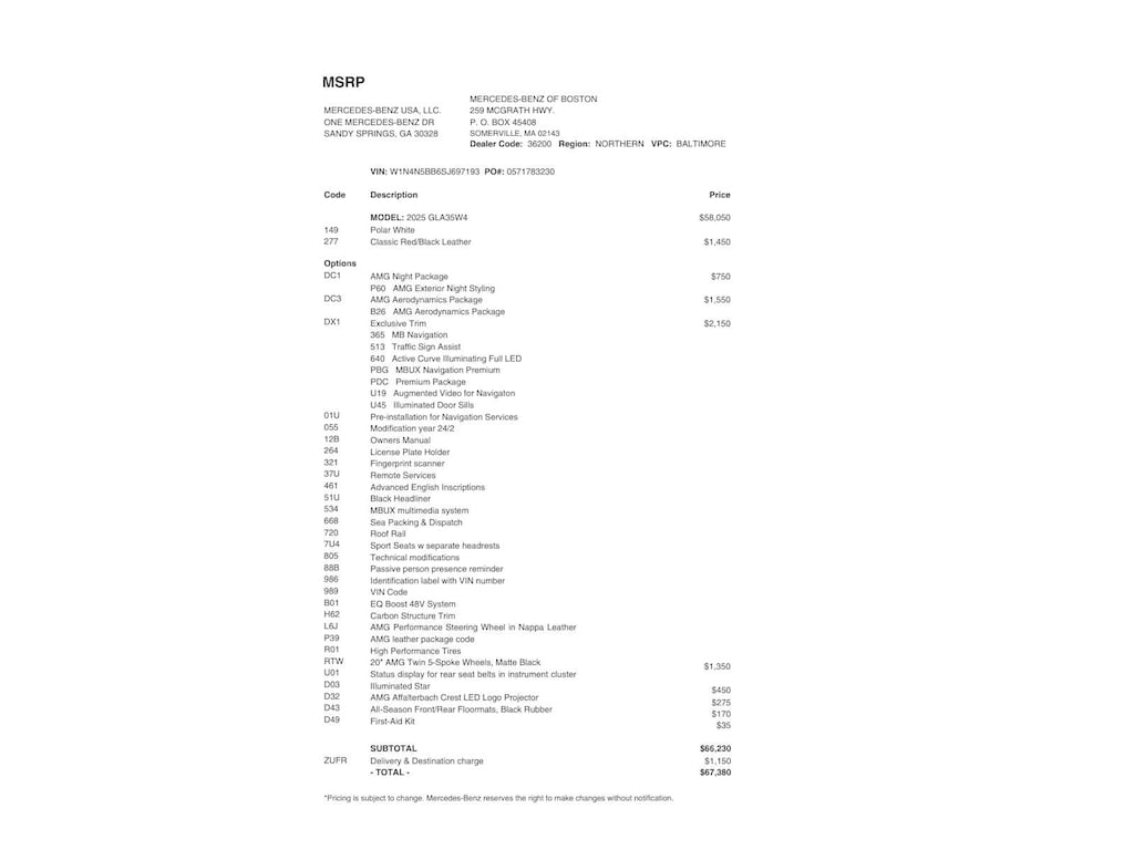 Service Work completed on this Mercedes-Benz AMG® GLA 35 included: Oil & Filter Change Using Original OEM Parts, Battery Voltage Test, Tires Inspected, Brake Inspection, Emissions System Check, Professional Detailed Inside and Out, Function Test all Lights, Cooling System Inspection, Transmission Fluid Inspection, Differential Fluid Inspection, Function Test all Options & Accessories.