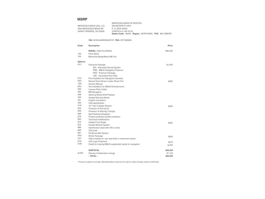EXCLUSIVE PACKAGE: MB Navigation, MBUX Augmented Reality for Navigation, Music Streaming, Advanced Sound System, Door Sills w/Mercedes-Benz Lettering, HEATED FRONT SEATS, WINTER PACKAGE: Heated Washer System, Heated Steering Wheel, NATURAL GRAIN BROWN LINDEN WOOD TRIM, LED LOGO PROJECTOR, WHEELS: 18 TWIN 5-SPOKE ALLOY.