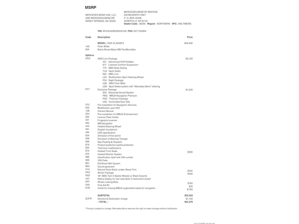 AMG® NIGHT PACKAGE: AMG® Body Styling, Sport Seats, Lowered Comfort Suspension, AMG® Floor Mats, Sport Brake System w/Mercedes-Benz Lettering, Multifunction Sport Steering Wheel, EXCLUSIVE PACKAGE: MB Navigation, MBUX Augmented Reality for Navigation, Music Streaming, Advanced Sound System, Door Sills w/Mercedes-Benz Lettering, HEATED FRONT SEATS, WINTER PACKAGE: Heated Washer System, Heated Steering Wheel, NATURAL GRAIN BLACK LINDEN WOOD INTERIOR TRIM.