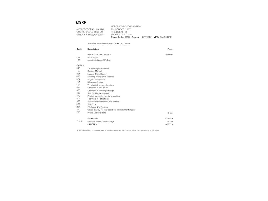 Service Work completed on this Mercedes-Benz CLA 250 included: Oil & Filter Change Using Original OEM Parts, Battery Voltage Test, Tires Inspected, Brake Inspection, Emissions System Check, Professional Detailed Inside and Out, Function Test all Lights, Cooling System Inspection, Transmission Fluid Inspection, Differential Fluid Inspection, Function Test all Options & Accessories.