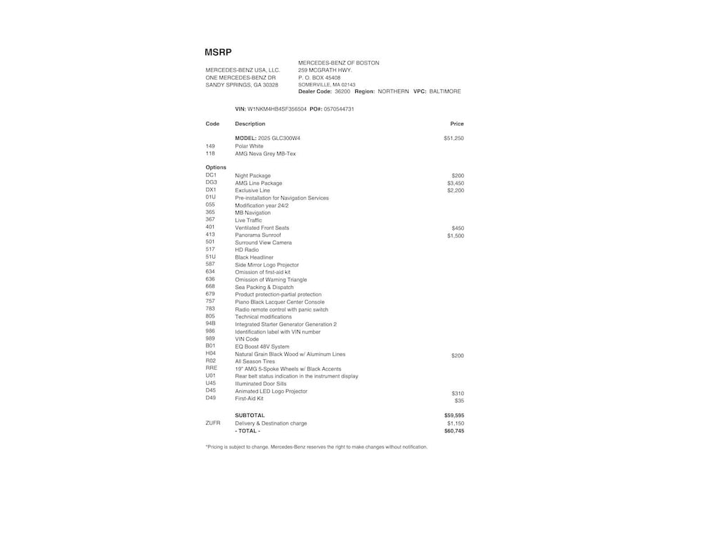 AMG® LINE: AMG® Line Body Styling, AMG® Line Interior, MB-Tex Instrument Panel, beltlines in black Nappa look, AMG® Line Floor Mats, Wheel Arch Trim Painted in Body Color, Flat-Bottom Multifunction Sport Steering Wheel, Perforated Brake Discs, Mercedes-Benz lettered calipers, AMG® Line Exterior, EXCLUSIVE TRIM: Surround View System, Enhanced Ambient Lighting, MB Navigation, Burmester® 3D Surround Sound System, 15 high-performance speakers, Sound Personalization, Illuminated Door Sills, GUARD 360, picture taking functionality, PANORAMA SUNROOF, VENTILATED FRONT SEATS, ANIMATED LED LOGO PROJECTOR, NIGHT PACKAGE: High-Gloss Black Elements, front wing, grille lamellas, rear diffuser insert, exterior mirrors, beltline and window trim, Black Roof Rails, NATURAL GRAIN BLACK WOOD W/ALUMINUM LINES TRIM.