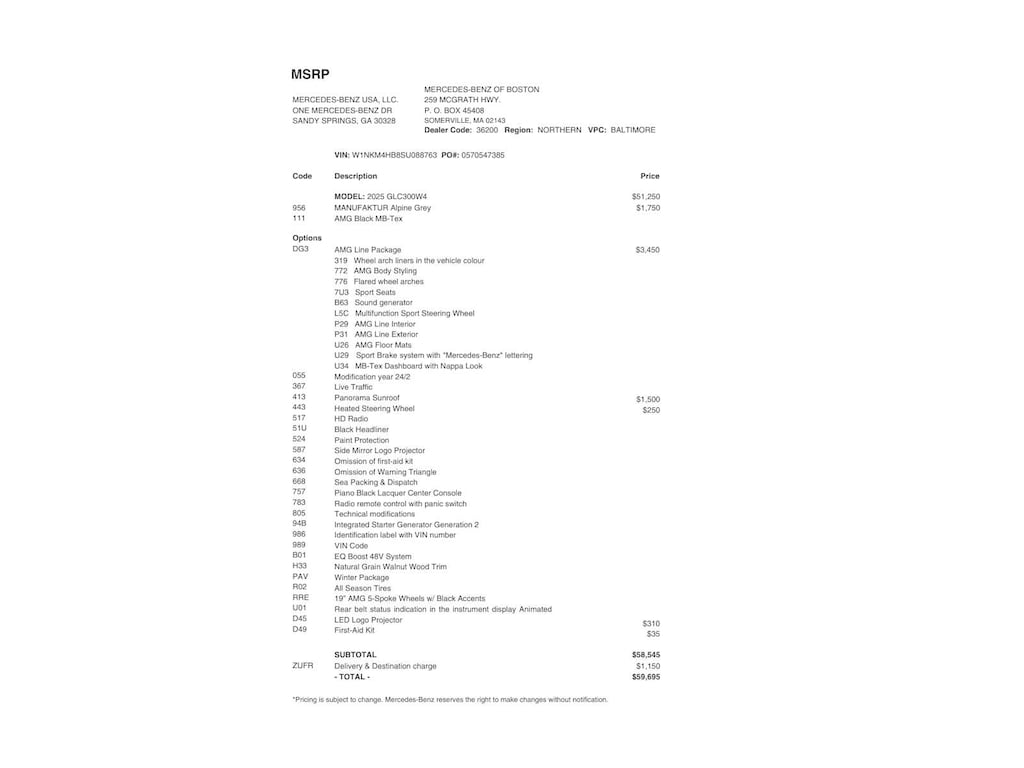 AMG® LINE: AMG® Line Body Styling, AMG® Line Interior, MB-Tex Instrument Panel, beltlines in black Nappa look, AMG® Line Floor Mats, Wheel Arch Trim Painted in Body Color, Flat-Bottom Multifunction Sport Steering Wheel, Perforated Brake Discs, Mercedes-Benz lettered calipers, AMG® Line Exterior, PANORAMA SUNROOF, ANIMATED LED LOGO PROJECTOR, HEATED STEERING WHEEL.