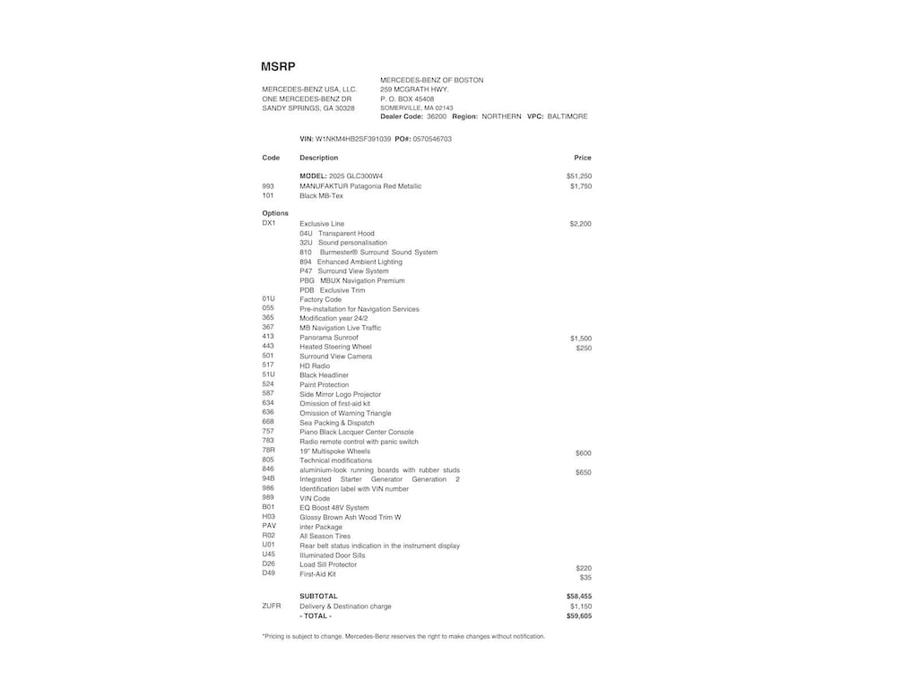 Service Work completed on this Mercedes-Benz GLC 300 included: Oil & Filter Change Using Original OEM Parts, Battery Voltage Test, Tires Inspected, Brake Inspection, Emissions System Check, Professional Detailed Inside and Out, Function Test all Lights, Cooling System Inspection, Transmission Fluid Inspection, Differential Fluid Inspection, Function Test all Options & Accessories.