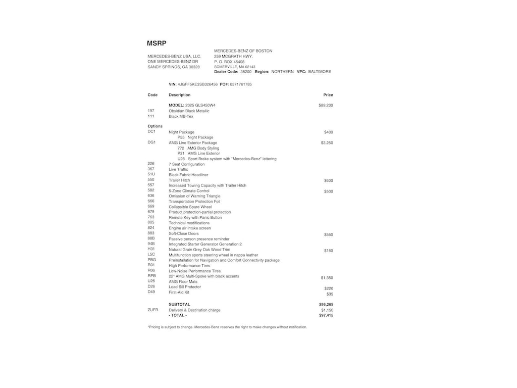Service Work completed on this Mercedes-Benz GLS 450 included: Oil & Filter Change Using Original OEM Parts, Battery Voltage Test, Tires Inspected, Brake Inspection, Emissions System Check, Professional Detailed Inside and Out, Function Test all Lights, Cooling System Inspection, Transmission Fluid Inspection, Differential Fluid Inspection, Function Test all Options & Accessories.