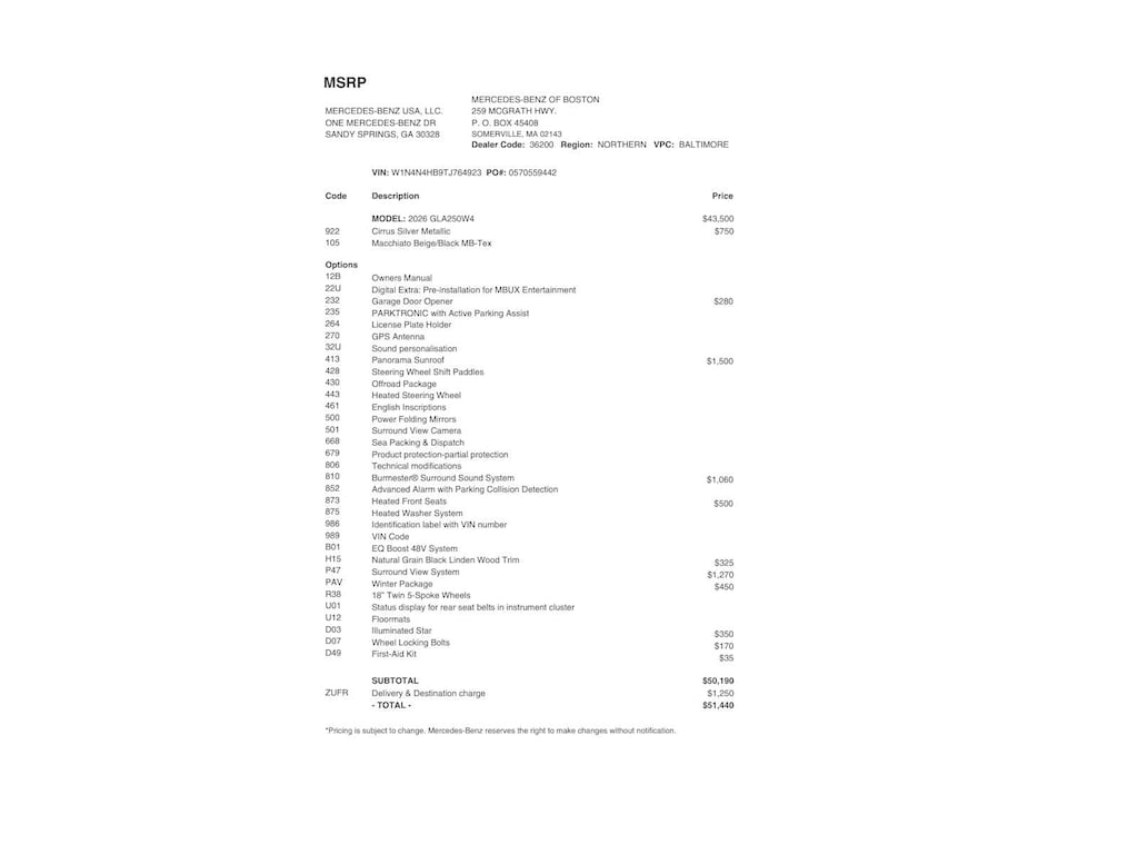 Service Work completed on this Mercedes-Benz GLA 250 included: Oil & Filter Change Using Original OEM Parts, Battery Voltage Test, Tires Inspected, Brake Inspection, Emissions System Check, Professional Detailed Inside and Out, Function Test all Lights, Cooling System Inspection, Transmission Fluid Inspection, Differential Fluid Inspection, Function Test all Options & Accessories.