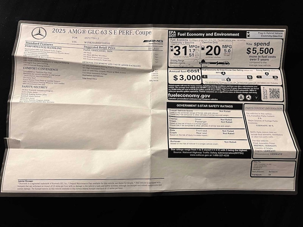 OPTION PACKAGES DRIVER ASSISTANCE PACKAGE: active lane change assist, PRESAFE® Impulse side, Active Speed Limit Assist, extended automatic restarting, Active Emergency Stop Assist, Evasive Steering Assist, Active Blind Spot Assist w/exit warning and end-of-traffic emergency braking, PRESAFE® PLUS, DISTRONIC PLUS® w/Steering & Stop & Go Assist, PRESAFE® Brake w/Pedestrian Recognition, BAS PLUS w/Cross-Traffic Assist, Active Distance Assist DISTRONIC®, Route-Based Speed Adaptation, Driver Assistance Package Plus, WHEELS: 9.5J X 20 FR & 10.0J X 20 RR TWIN 10-SPK: AMG®, black accents. MP3 Player, Remote Trunk Release, Privacy Glass, Keyless Entry, Child Safety Locks.