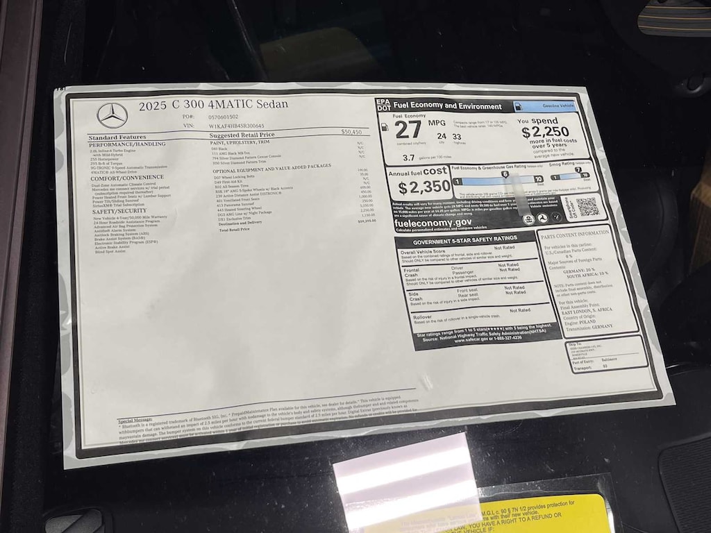 EXCELLENT SAFETY FOR YOUR FAMILY Electronic Stability Control, Brake Assist, 4-Wheel ABS, Tire Pressure Monitoring System, 4-Wheel Disc Brakes Mercedes-Benz C 300 with Black exterior and AMG® Black interior features a 4 Cylinder Engine with 255 HP at 5800 RPM*.