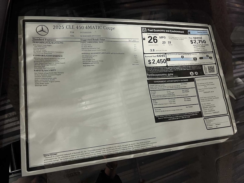 KEY FEATURES INCLUDE Navigation, Sunroof, Panoramic Roof, Full-Time 4MATIC® All-Wheel, Quad Bucket Seats, Power Liftgate, Heated Driver Seat, Back-Up Camera, Premium Sound System, Satellite Radio, iPod/MP3 Input, Onboard Communications System, Aluminum Wheels, Keyless Start, Dual Zone A/C Mercedes-Benz CLE 450 with Polar White exterior and Black interior features a Straight 6 Cylinder Engine with 375 HP at 5500 RPM*. Rear Spoiler, MP3 Player, Remote Trunk Release, Keyless Entry, Steering Wheel Controls.