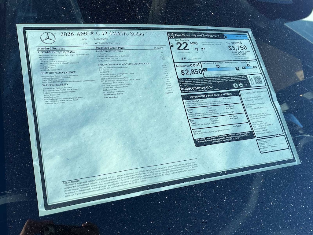 EXCELLENT SAFETY FOR YOUR FAMILY Child Safety Locks, Electronic Stability Control, Brake Assist, 4-Wheel ABS, Tire Pressure Monitoring System, 4-Wheel Disc Brakes Mercedes-Benz AMG® C 43 with Polar White exterior and Black w/Red Stitching interior features a 4 Cylinder Engine with 416 HP at 6750 RPM*.