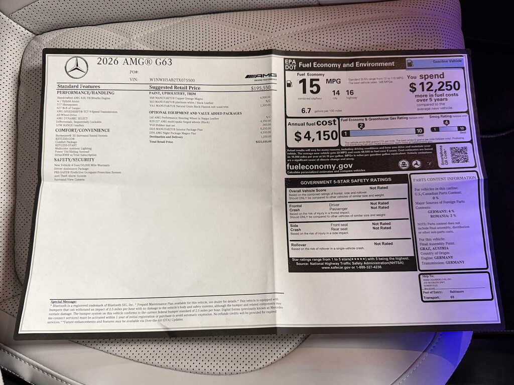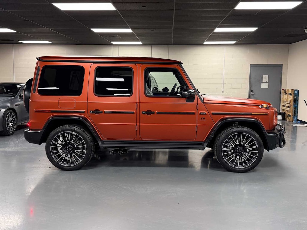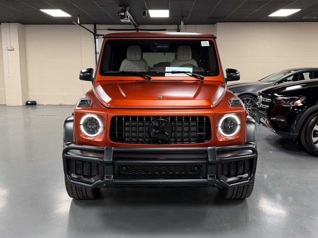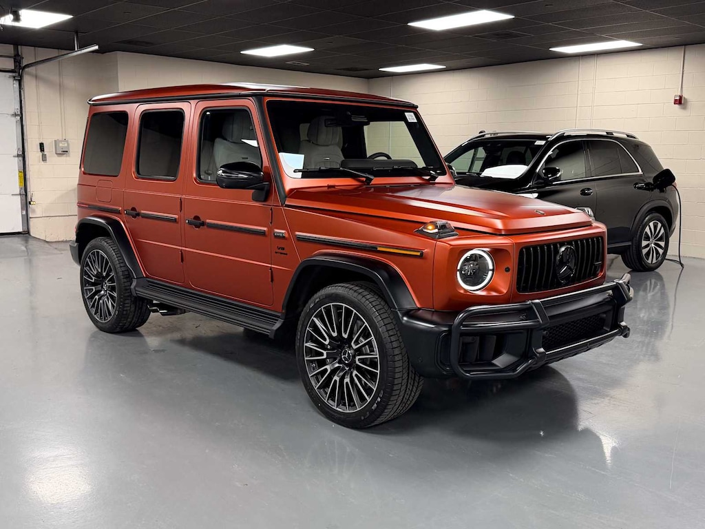 EXCELLENT SAFETY FOR YOUR FAMILY Lane Keeping Assist, Cross-Traffic Alert, Electronic Stability Control, Brake Assist, 4-Wheel ABS, 4-Wheel Disc Brakes, Tire Pressure Monitoring System Mercedes-Benz AMG® G 63 with MANUFAKTUR Copper Orange Magno exterior and Platinum White interior features a 8 Cylinder Engine with 577 HP at 6000 RPM*.