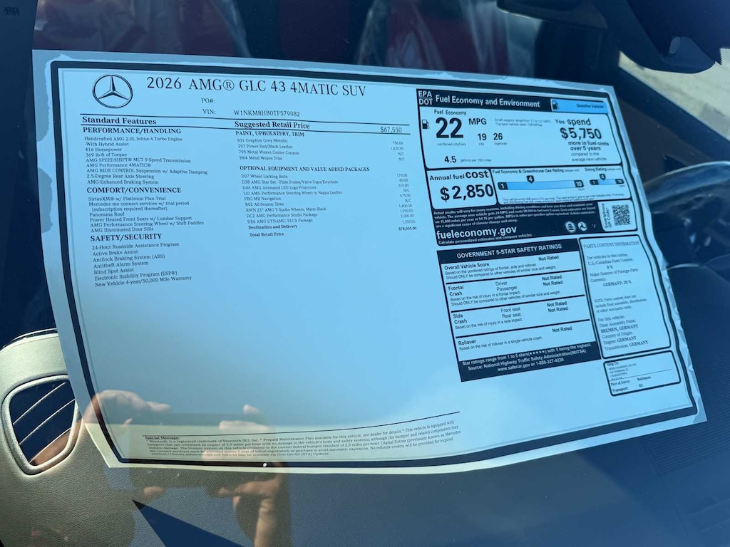 KEY FEATURES INCLUDE Sunroof, Panoramic Roof, Full-Time 4MATIC® All-Wheel, Power Liftgate, Heated Driver Seat, Back-Up Camera, Turbocharged, Satellite Radio, iPod/MP3 Input, Onboard Communications System, Keyless Start, Dual Zone A/C, Smart Device Integration, Hands-Free Liftgate, WiFi Hotspot Mercedes-Benz AMG® GLC 43 with Graphite Grey Metallic exterior and AMG® Power Red/Black interior features a 4 Cylinder Engine with 416 HP at 6750 RPM*.