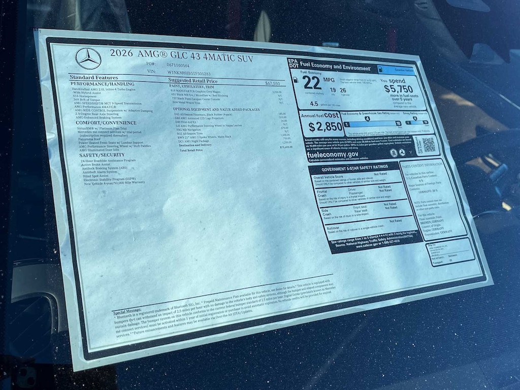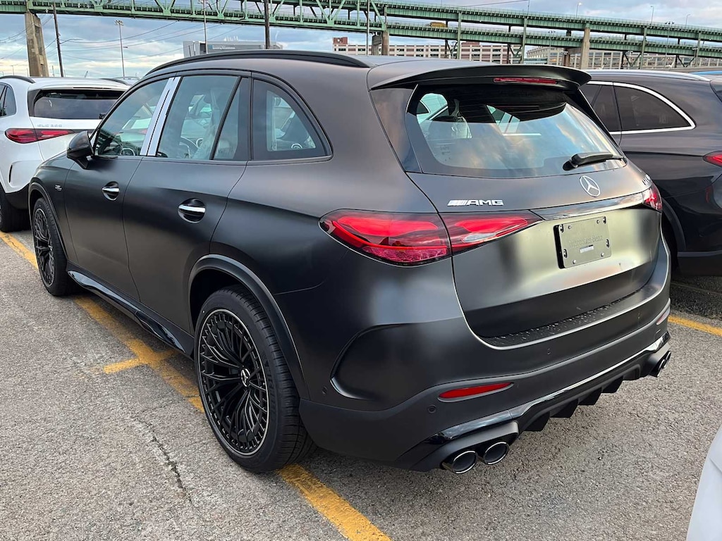 EXCELLENT SAFETY FOR YOUR FAMILY Cross-Traffic Alert, Blind Spot Monitor, Child Safety Locks, Electronic Stability Control, Brake Assist, 4-Wheel ABS, Tire Pressure Monitoring System, 4-Wheel Disc Brakes Mercedes-Benz AMG® GLC 43 with MANUFAKTUR Graphite Grey Magno exterior and Black w/Red Accents interior features a 4 Cylinder Engine with 416 HP at 6750 RPM*.