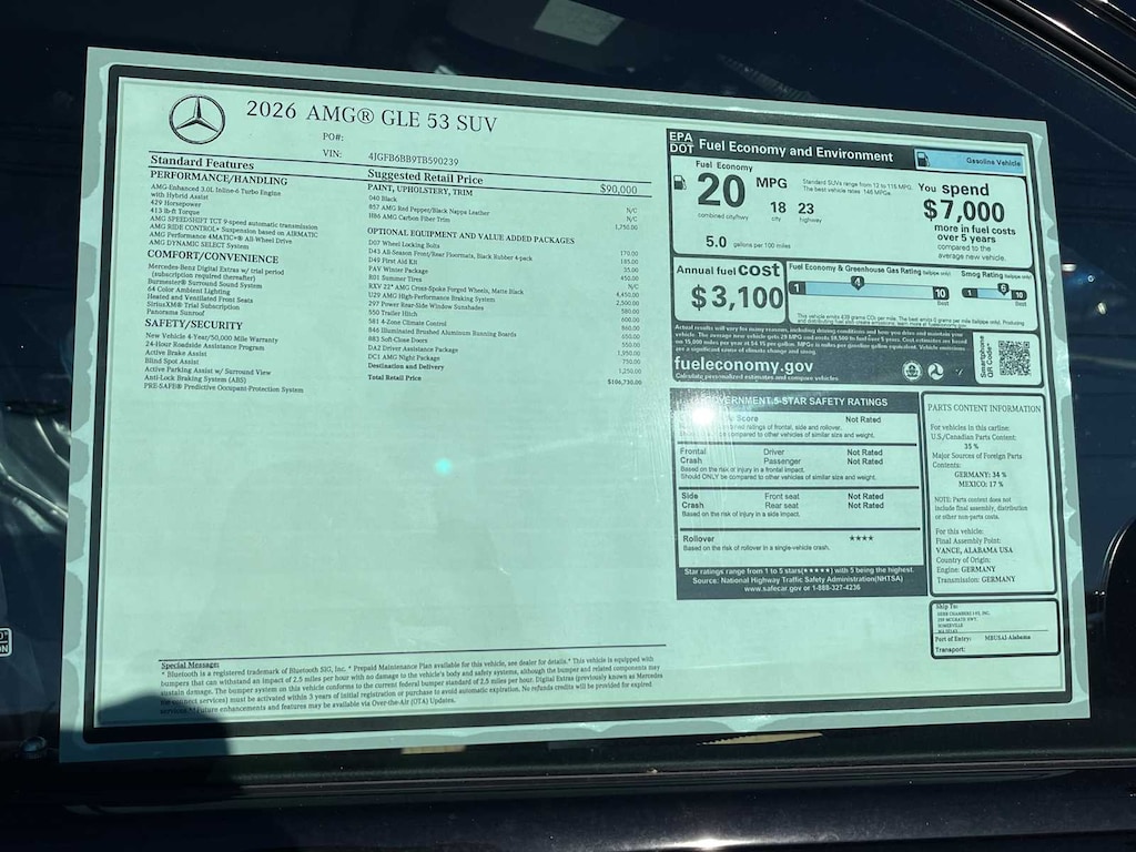 EXCELLENT SAFETY FOR YOUR FAMILY Blind Spot Monitor, Lane Keeping Assist, Electronic Stability Control, Brake Assist, 4-Wheel ABS, 4-Wheel Disc Brakes, Tire Pressure Monitoring System Mercedes-Benz AMG® GLE 53 with Black exterior and Red Pepper/Black interior features a Straight 6 Cylinder Engine with 429 HP at 6100 RPM*.