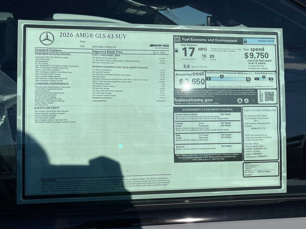 OPTION PACKAGES WHEELS: 23 AMG® MONOBLOCK FORGED, MATTE BLACK Tires: 285/40R23 Front & 325/35R23 Rear, AMG® CARBON FIBER TRIM: center console in piano black trim, ACOUSTIC COMFORT PACKAGE, AMG® PERF STEERING WHEEL IN CARBON FIBER/MICROFIBER, AMG® NIGHT PACKAGE matte black roof rails, A-wing trim, rear apron trim, tailpipes, front splitter, window frames and railing in high-gloss black and heat-insulating dark-tinted glass, REAR SIDE AIRBAGS, ELECTRIC SECOND-ROW SUNSHADES, LOAD SILL GUARD.