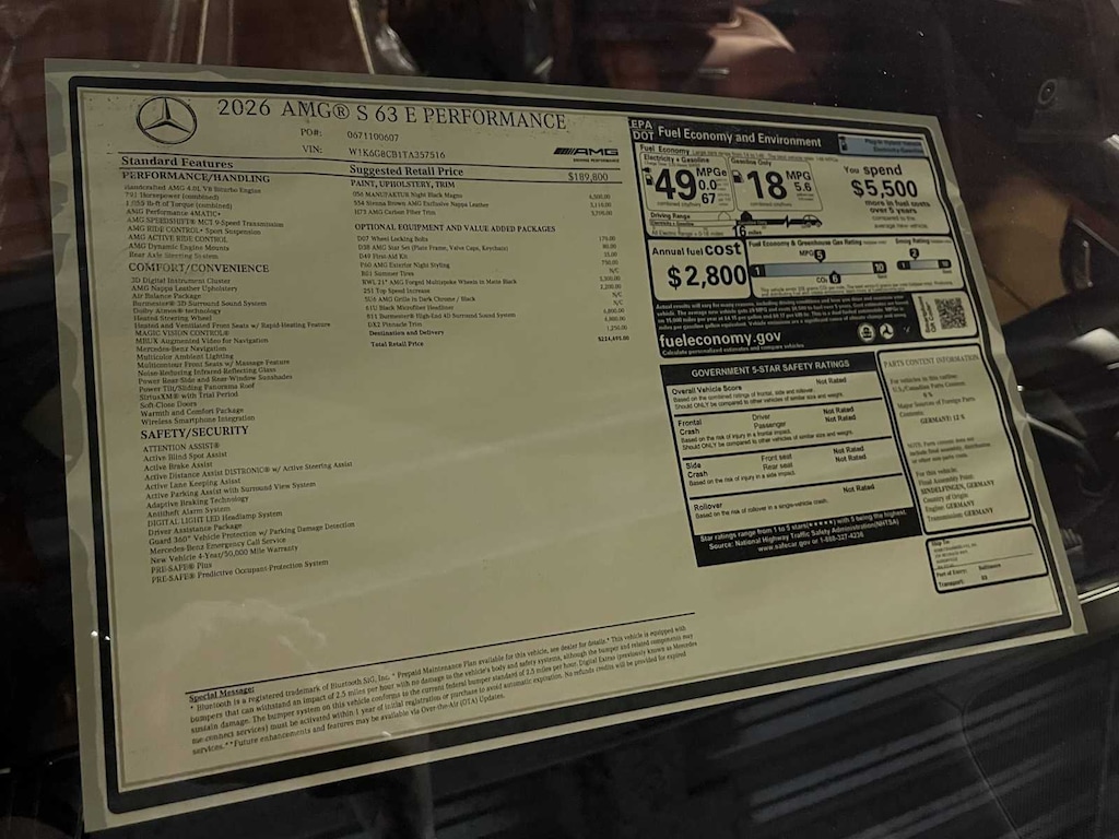 Burmester® HIGH-END 4D SURROUND SOUND SYSTEM 31-high end speakers w/1750 watts of output, PINNACLE TRIM MBUX Rear Gesture Control, Rear ENERGIZING Package, Rear Seat Comfort Package, adjustable rear luxury headrests, Four-Zone Climate Control, Reduces storage space in front center armrest area, Illuminated Seatbelt Buckles, Electrically Adjustable Front Passenger Seat, Executive Rear Seats, 43.5 degree recline and extendable calf rest for right rear seat, Rear Neck & Shoulder Heating, Calf Massage Function, For rear right passenger, Adaptive Rear Compartment Lighting, Rear Seat Frontal Airbags, Chauffeur Function, function to fold front right backrest forwards up to 23 degrees and power extending footrest for rear seat, MBUX Rear Tablet, Rear Seat Belt Airbags, EASY-ADJUST Luxury Front Headrests, Rear Multicontour Seats w/Massage, Rear Seatbelt Presenters, For outboard rear, AMG® CARBON FIBER TRIM, WHEELS: BLACK 21 AMG® FORGED MULTI-SPOKE Matte black, Tires: 255/40R21 Fr & 285/35R21 Rr, SIENNA BROWN, AMG® EXCLUSIVE NAPPA LEATHER UPHOLSTERY, TOP SPEED INCREASE: Increases vehicle top speed from 155 mph to 180 mph, AMG® NIGHT PACKAGE W/DARK FRONT GRILLE: mirrors, beltine and front bumper trim in high-gloss black, side sill panel, rear bumper and A-wing trim in black chrome and chrome-plated twin tailpipe trims in black.