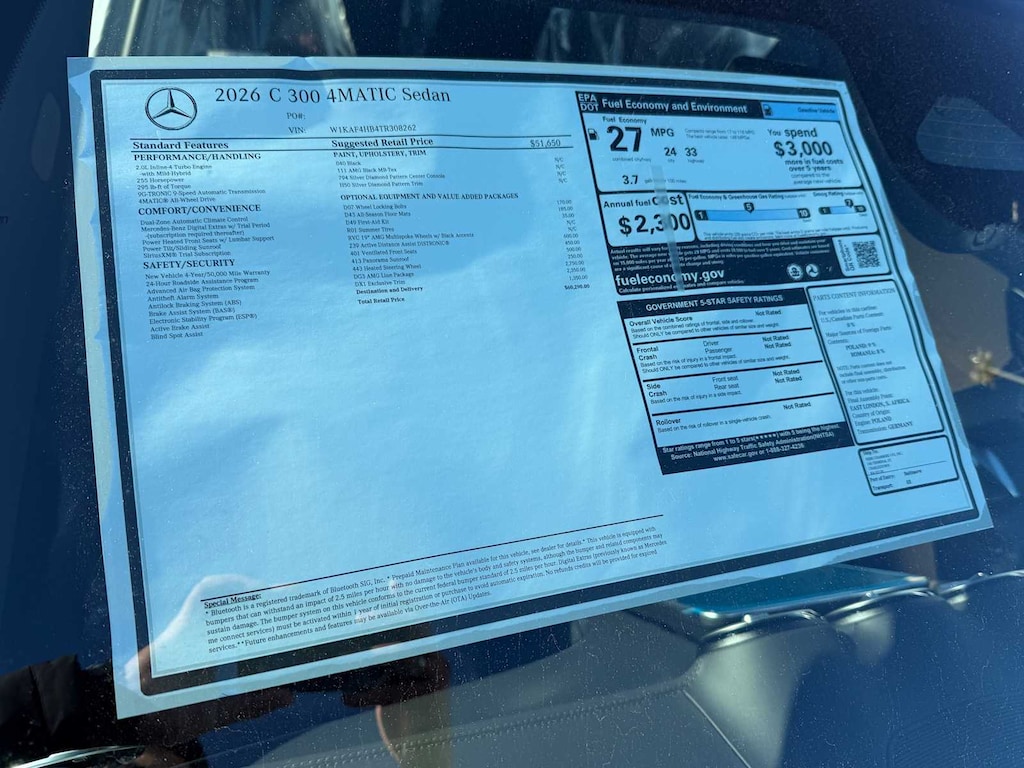 EXCELLENT SAFETY FOR YOUR FAMILY Electronic Stability Control, Brake Assist, 4-Wheel ABS, Tire Pressure Monitoring System, 4-Wheel Disc Brakes Mercedes-Benz C 300 with Black exterior and AMG® Black interior features a 4 Cylinder Engine with 255 HP at 5800 RPM*.