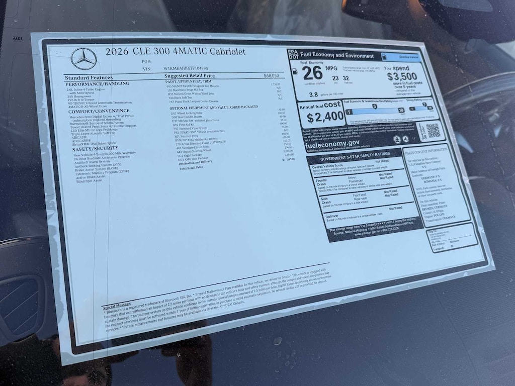 EXCELLENT SAFETY FOR YOUR FAMILY Blind Spot Monitor, Electronic Stability Control, Brake Assist, 4-Wheel ABS, 4-Wheel Disc Brakes, Tire Pressure Monitoring System Mercedes-Benz CLE 300 with MANUFAKTUR Patagonia Red Metallic exterior and Macchiato Beige interior features a 4 Cylinder Engine with 255 HP at 5800 RPM*.