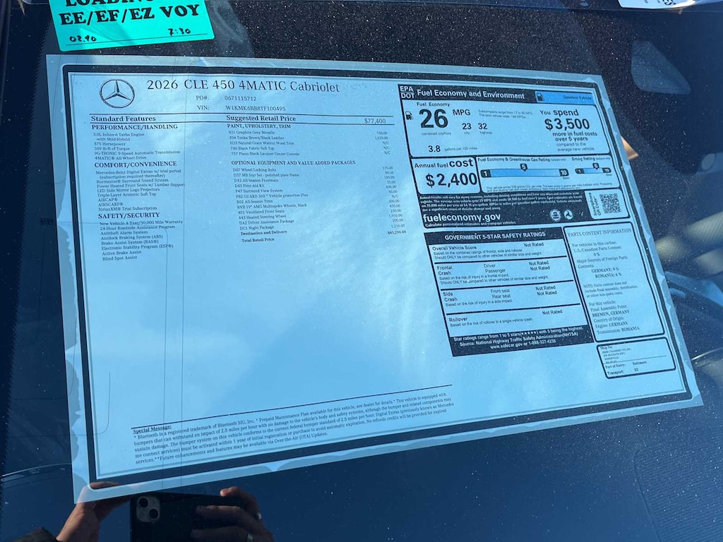 EXCELLENT SAFETY FOR YOUR FAMILY Cross-Traffic Alert, Electronic Stability Control, Brake Assist, 4-Wheel ABS, 4-Wheel Disc Brakes, Tire Pressure Monitoring System Mercedes-Benz CLE 450 with Graphite Grey Metallic exterior and Tonka Brown/Black interior features a Straight 6 Cylinder Engine with 375 HP at 5500 RPM*.