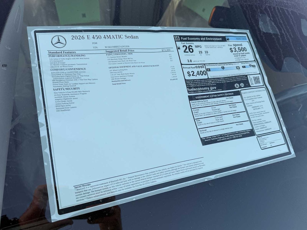 OPTION PACKAGES DRIVER ASSISTANCE PACKAGE Active Lane Keeping Assist, Active Distance Assist DISTRONIC®, Active Steering Assist, Traffic Sign Assist, Active Speed Limit Assist, PRESAFE® Impulse Side, Driving Assist Package Plus, WHEELS: 19 MULTI-SPOKE LIGHT-ALLOY 19 x 8.5J front and 19 x 9.5J rear, Tires: 245/45R19 Fr & 275/40R19 Rr, WINTER PACKAGE Heated Steering Wheel, Winter Package Factory Code, Heated Windscreen Washer System.