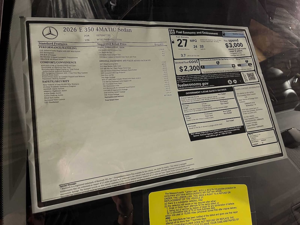Electronic Stability Control, Brake Assist, 4-Wheel ABS, 4-Wheel Disc Brakes, Tire Pressure Monitoring System Mercedes-Benz E 350 with MANUFAKTUR Alpine Grey exterior and Black interior features a 4 Cylinder Engine with 255 HP at 5800 RPM*.