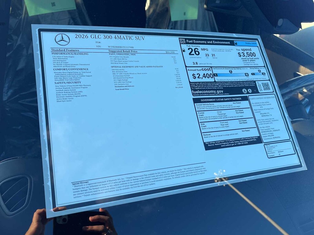 EXCELLENT SAFETY FOR YOUR FAMILY Child Safety Locks, Electronic Stability Control, Brake Assist, 4-Wheel ABS, Tire Pressure Monitoring System, 4-Wheel Disc Brakes Mercedes-Benz GLC 300 with Graphite Grey Metallic exterior and AMG® Black interior features a 4 Cylinder Engine with 255 HP at 5800 RPM*.