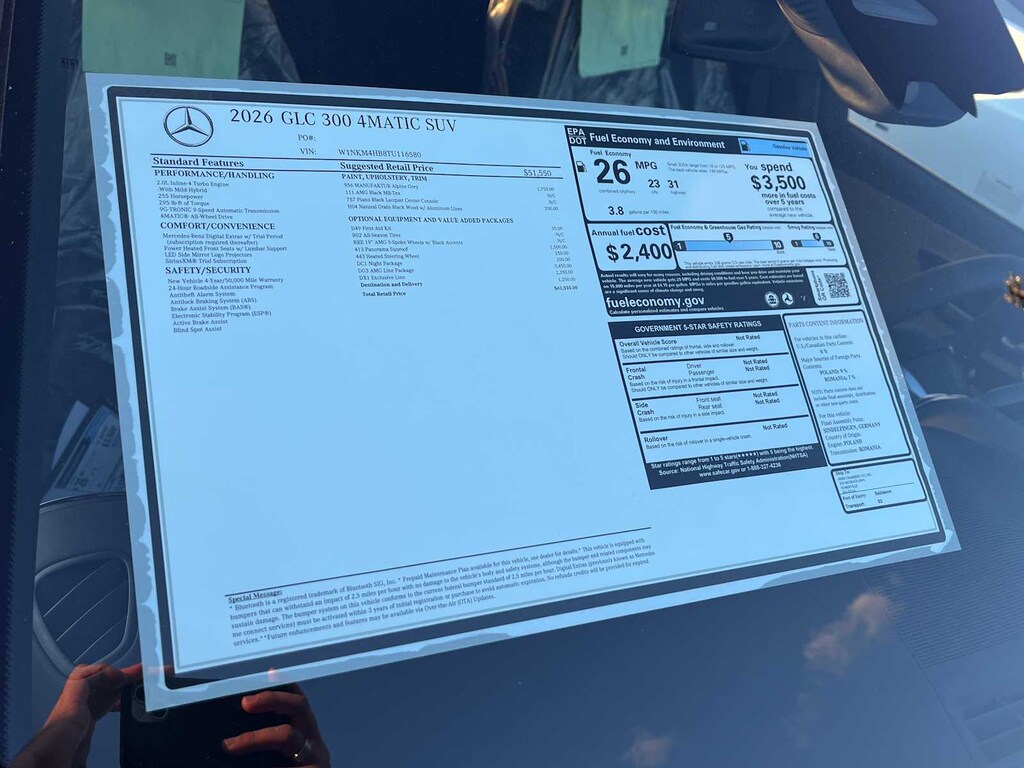 EXCELLENT SAFETY FOR YOUR FAMILY Blind Spot Monitor, Child Safety Locks, Electronic Stability Control, Brake Assist, 4-Wheel ABS, Tire Pressure Monitoring System, 4-Wheel Disc Brakes Mercedes-Benz GLC 300 with MANUFAKTUR Alpine Grey exterior and AMG® Black interior features a 4 Cylinder Engine with 255 HP at 5800 RPM*.