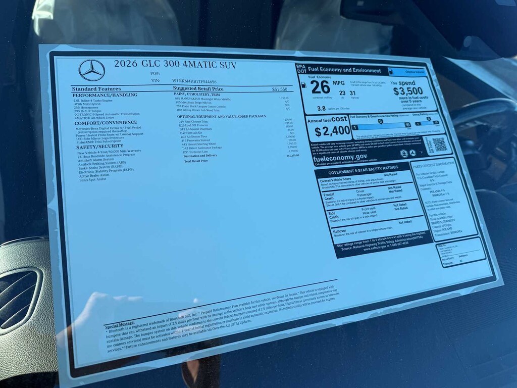 OPTION PACKAGES EXCLUSIVE TRIM MBUX Entertainment Plus, Surround View System, Enhanced Ambient Lighting, MB Navigation, Burmester® 3D Surround Sound System, 15 high-performance speakers, Sound Personalization, Illuminated Door Sills, GUARD 360, picture taking functionality, DRIVER ASSISTANCE PACKAGE route-based speed adaptation, PRESAFE® PLUS, Active Lane Change Assist, DISTRONIC PLUS® w/Steering Assist, stop and go assist, PRESAFE® Brake w/Pedestrian Recognition, BAS PLUS w/Cross-Traffic Assist, Active Speed Limit Assist, PRESAFE® Impulse Side, Automatic Lane Change, Driver Assistance Package Plus, PANORAMA SUNROOF, HEATED STEERING WHEEL, REAR CHROME TRIM.
