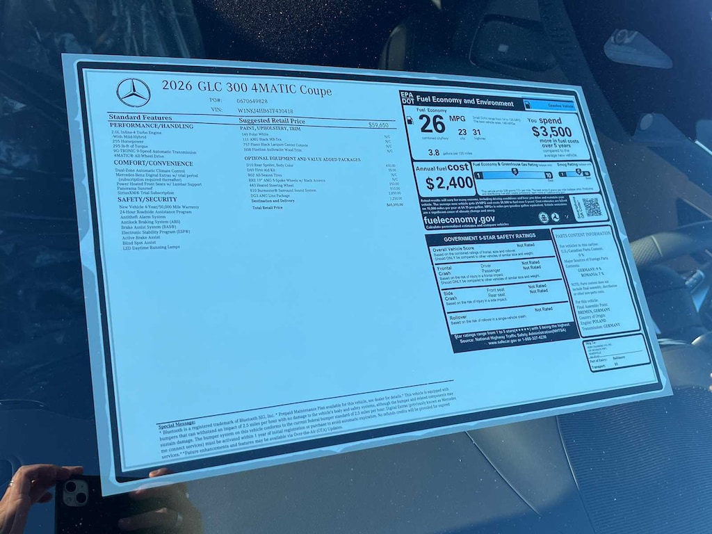 EXCELLENT SAFETY FOR YOUR FAMILY Blind Spot Monitor, Child Safety Locks, Electronic Stability Control, Brake Assist, 4-Wheel ABS, 4-Wheel Disc Brakes, Tire Pressure Monitoring System Mercedes-Benz GLC 300 with Polar White exterior and AMG® Black interior features a 4 Cylinder Engine with 255 HP at 5800 RPM*.