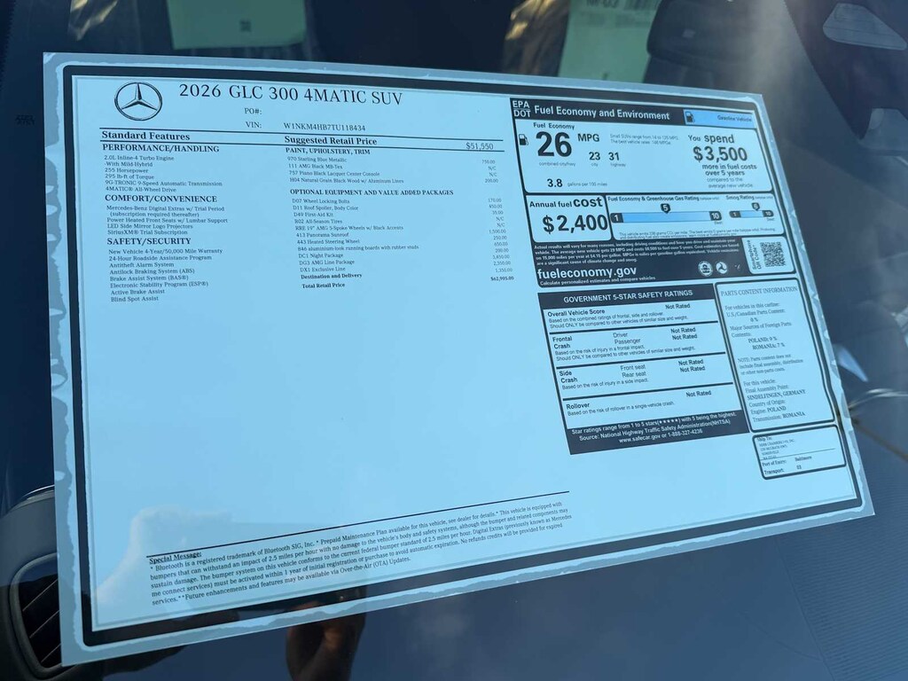 EXCELLENT SAFETY FOR YOUR FAMILY Blind Spot Monitor, Child Safety Locks, Electronic Stability Control, Brake Assist, 4-Wheel ABS, Tire Pressure Monitoring System, 4-Wheel Disc Brakes Mercedes-Benz GLC 300 with Starling Blue Metallic exterior and AMG® Black interior features a 4 Cylinder Engine with 255 HP at 5800 RPM*.