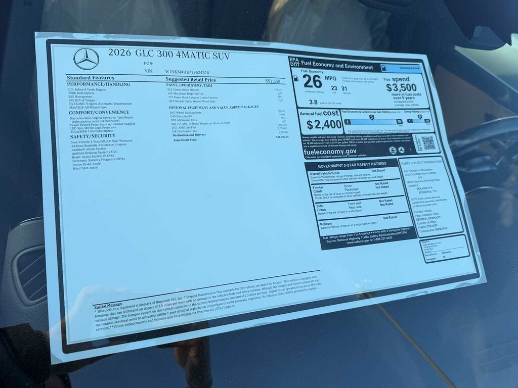 OPTION PACKAGES EXCLUSIVE TRIM MBUX Entertainment Plus, Surround View System, Enhanced Ambient Lighting, MB Navigation, Burmester® 3D Surround Sound System, 15 high-performance speakers, Sound Personalization, Illuminated Door Sills, GUARD 360, picture taking functionality, AMG® LITE PLUS Body Color Roof Spoiler, Panorama Sunroof. MP3 Player, Keyless Entry, Remote Trunk Release, Privacy Glass, Steering Wheel Controls.