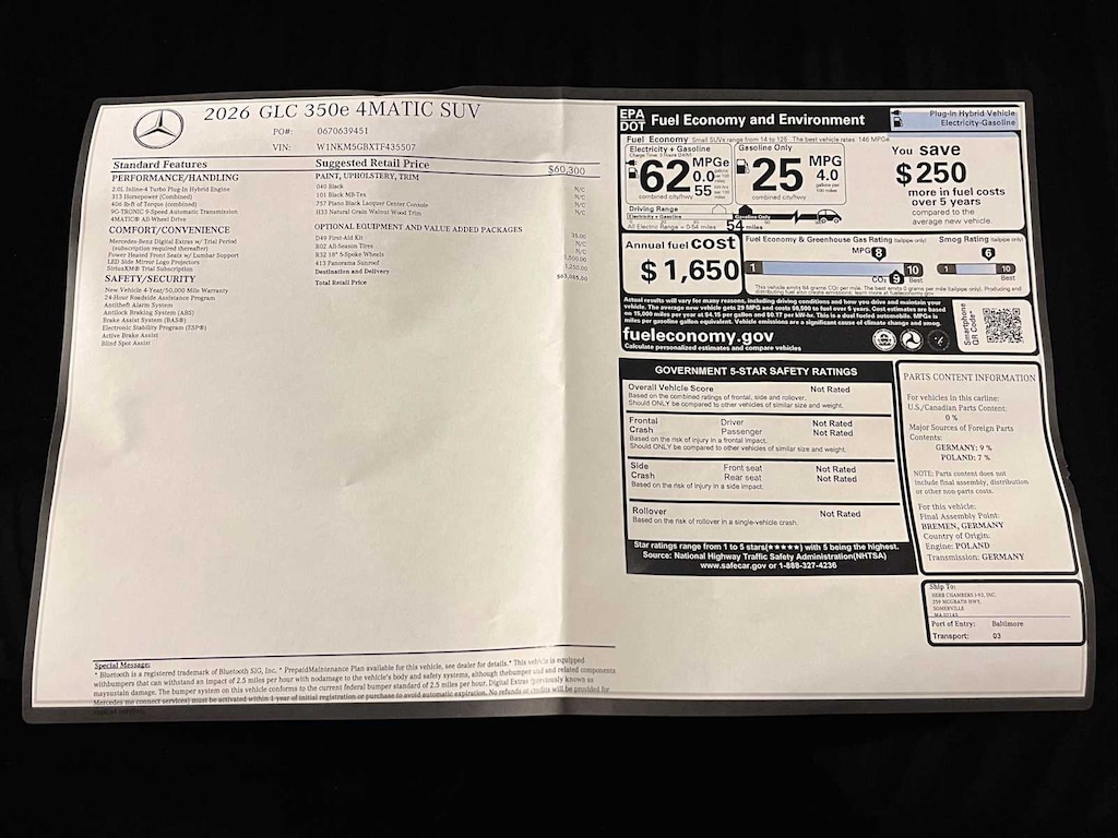 EXCELLENT SAFETY FOR YOUR FAMILY Child Safety Locks, Electronic Stability Control, Brake Assist, 4-Wheel ABS, 4-Wheel Disc Brakes, Tire Pressure Monitoring System Mercedes-Benz GLC 350e with Black exterior and Black interior features a 4 Cylinder Engine with 313 HP at 6100 RPM*.