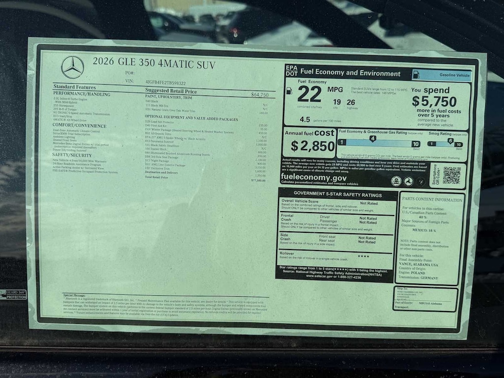 EXCELLENT SAFETY FOR YOUR FAMILY Child Safety Locks, Electronic Stability Control, Brake Assist, 4-Wheel ABS, 4-Wheel Disc Brakes, Tire Pressure Monitoring System Mercedes-Benz GLE 350 with Black exterior and Black interior features a 4 Cylinder Engine with 255 HP at 5800 RPM*.