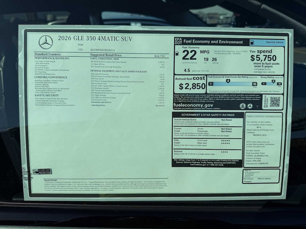 EXCELLENT SAFETY FOR YOUR FAMILY Child Safety Locks, Electronic Stability Control, Brake Assist, 4-Wheel ABS, Tire Pressure Monitoring System, 4-Wheel Disc Brakes Mercedes-Benz GLE 350 with MANUFAKTUR Ireland Mid Green Metallic exterior and Black interior features a 4 Cylinder Engine with 255 HP at 5800 RPM*.