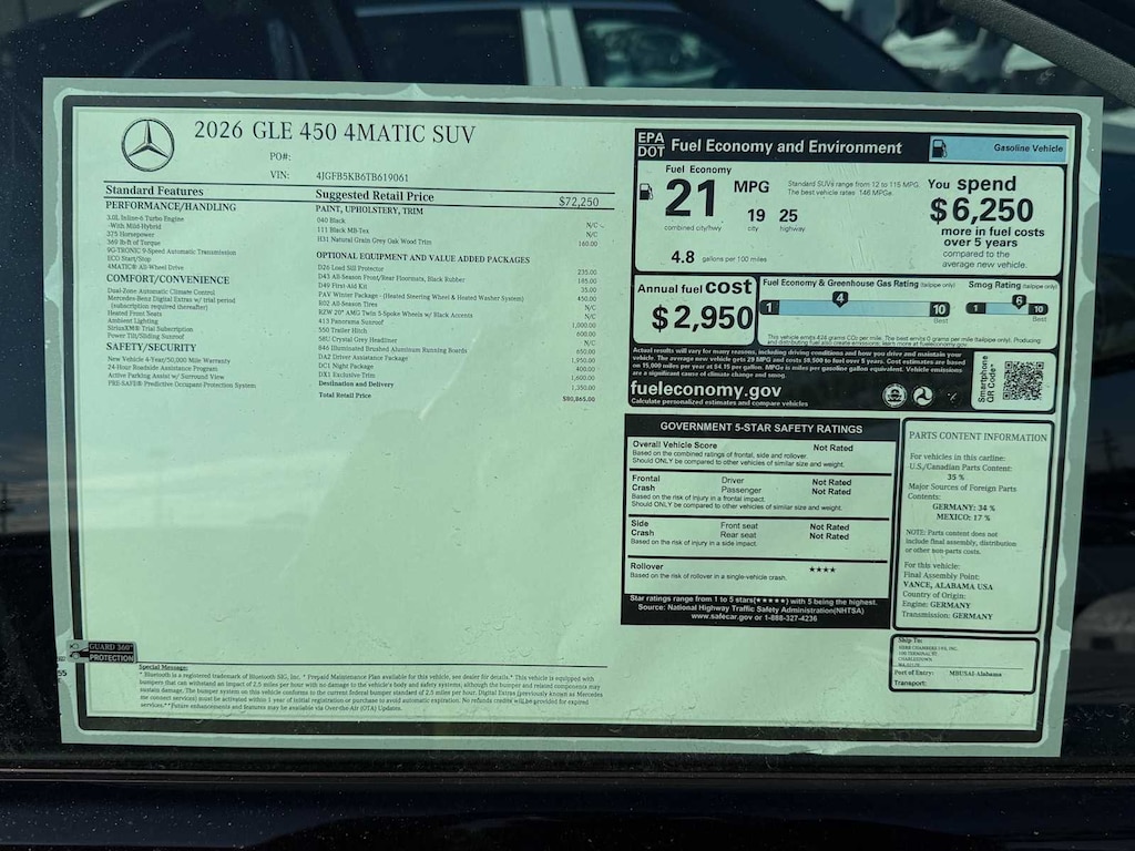 Heated Seats, NAV, Sunroof, Onboard Communications System, iPod/MP3 Input, Back-Up Camera, Power Liftgate, Full-Time 4MATIC® All-Wheel, Tow Hitch, WINTER PACKAGE, EXCLUSIVE TRIM, DRIVER ASSISTANCE PACKAGE, ILLUMINATED RUNNING BOARDS, TRAILER HITCH, PANORAMA POWER TILT/SLIDING SUNROOF, Alloy Wheels. FUEL EFFICIENT 25 MPG Hwy/19 MPG City! Black exterior and Black interior, GLE 450 trim. READ MORE!