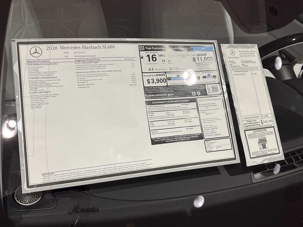Cross-Traffic Alert, Blind Spot Monitor, Rollover Protection System, Electronic Stability Control, Brake Assist, 4-Wheel ABS, 4-Wheel Disc Brakes, Tire Pressure Monitoring System Mercedes-Benz Maybach SL 680 Monogram Series with MANUFAKTUR Moonlight White Magno exterior and Crystal White interior features a 8 Cylinder Engine with 577 HP at 5500 RPM*.