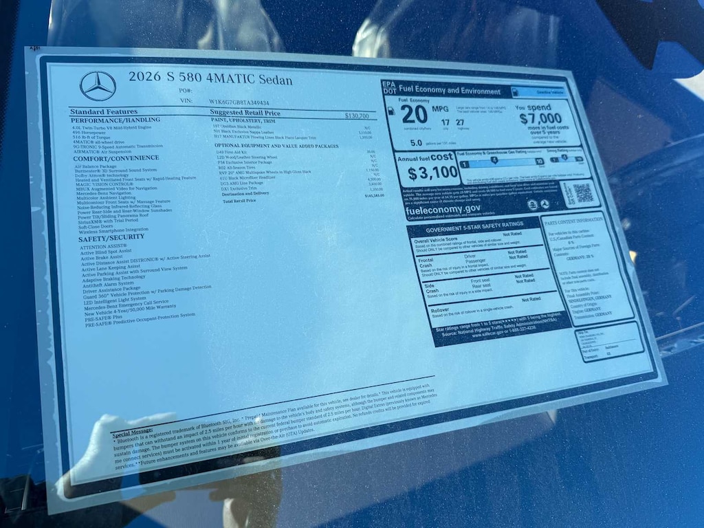 EXCELLENT SAFETY FOR YOUR FAMILY Lane Keeping Assist, Cross-Traffic Alert, Blind Spot Monitor, Electronic Stability Control, Brake Assist, 4-Wheel ABS, Tire Pressure Monitoring System, 4-Wheel Disc Brakes Mercedes-Benz S 580 with Obsidian Black Metallic exterior and Black interior features a 8 Cylinder Engine with 496 HP at 5500 RPM*.