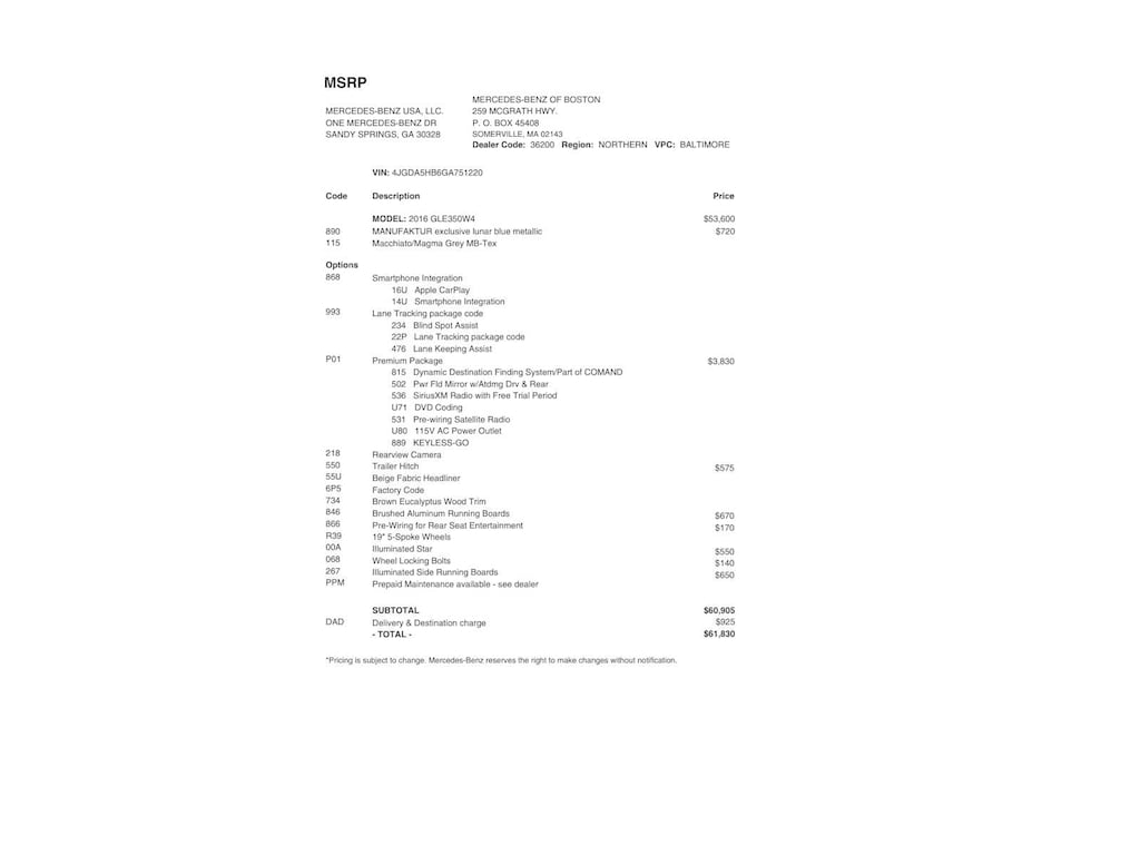 Service Work completed on this Mercedes-Benz GLE 350 included: Total Value: $554.83. Battery Voltage Test, Tires Inspected, Brake Inspection, Emissions System Check, Professional Detailed Inside and Out, Function Test all Lights, Cooling System Inspection, Transmission Fluid Inspection, Differential Fluid Inspection, Function Test all Options & Accessories.
