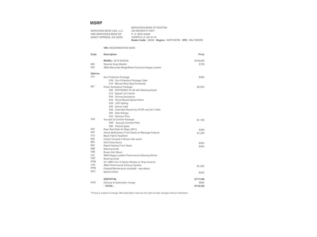 Service Work completed on this Mercedes-Benz AMG® E 63 included: Total Value: $1,872.50. Oil & Filter Change Using Original OEM Parts, Battery Voltage Test, Battery Replacement, Tires Inspected, Wheel/Tire Balance, Brake Inspection, 4 Wheel Alignment, Emissions System Check, Professional Detailed Inside and Out, Function Test all Lights, Cooling System Inspection, Transmission Fluid Inspection, Differential Fluid Inspection, Function Test all Options & Accessories.