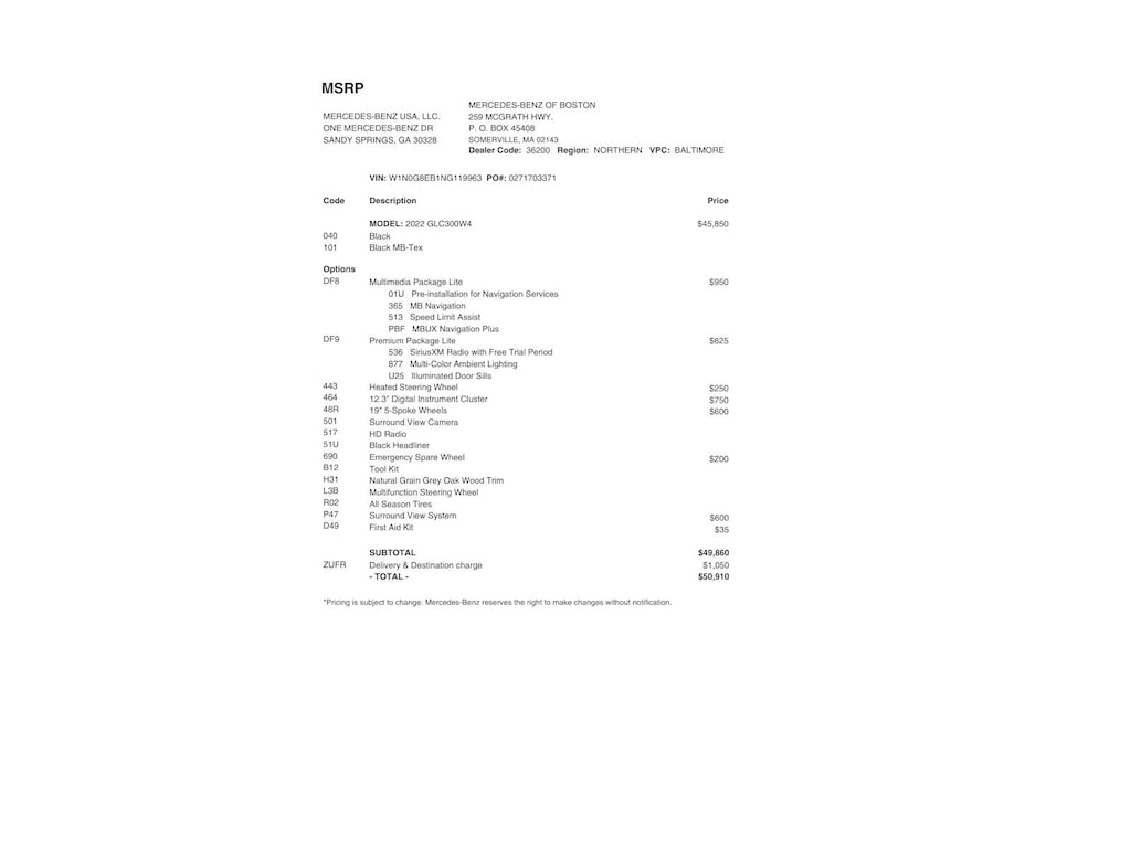 Service Work completed on this Mercedes-Benz GLC 300 included: Total Value: $1,643.50. Oil & Filter Change Using Original OEM Parts, Battery Voltage Test, Windshield Wiper Blades Replaced, Rear Glass Wiper Blade Replaced, Tires Inspected, Brake Inspection, Brake System Flush, Dust Filter Replaced, Cabin Air Filter Replaced, Emissions System Check, Professional Detailed Inside and Out, Function Test all Lights, Cooling System Inspection, Transmission Fluid Inspection, Differential Fluid Inspection, Function Test all Options & Accessories.
