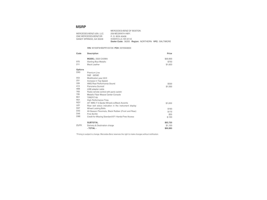 WHEELS: 20 X 8J FR & 20 X 9.5J RR AMG® SPLIT 10-SPK: black accents, Tires: 245/35R20 Fr & 265/30R20 Rr, Summer High-Performance Tires, TIREFIT Mobility Kit, PANORAMA ROOF, AMG® REAL PERFORMANCE SOUND.