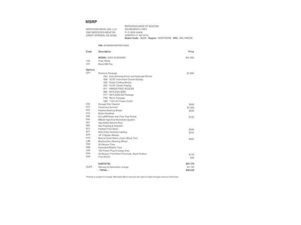 Service Work completed on this Mercedes-Benz GLB 250 included: Total Value: $1,416.95. Battery Voltage Test, Tires Inspected, Brake Inspection, Rear Brakes Pads Replaced, Rear Brake Rotors Replaced, Emissions System Check, Professional Detailed Inside and Out, Function Test all Lights, Cooling System Inspection, Transmission Fluid Inspection, Differential Fluid Inspection, Function Test all Options & Accessories.